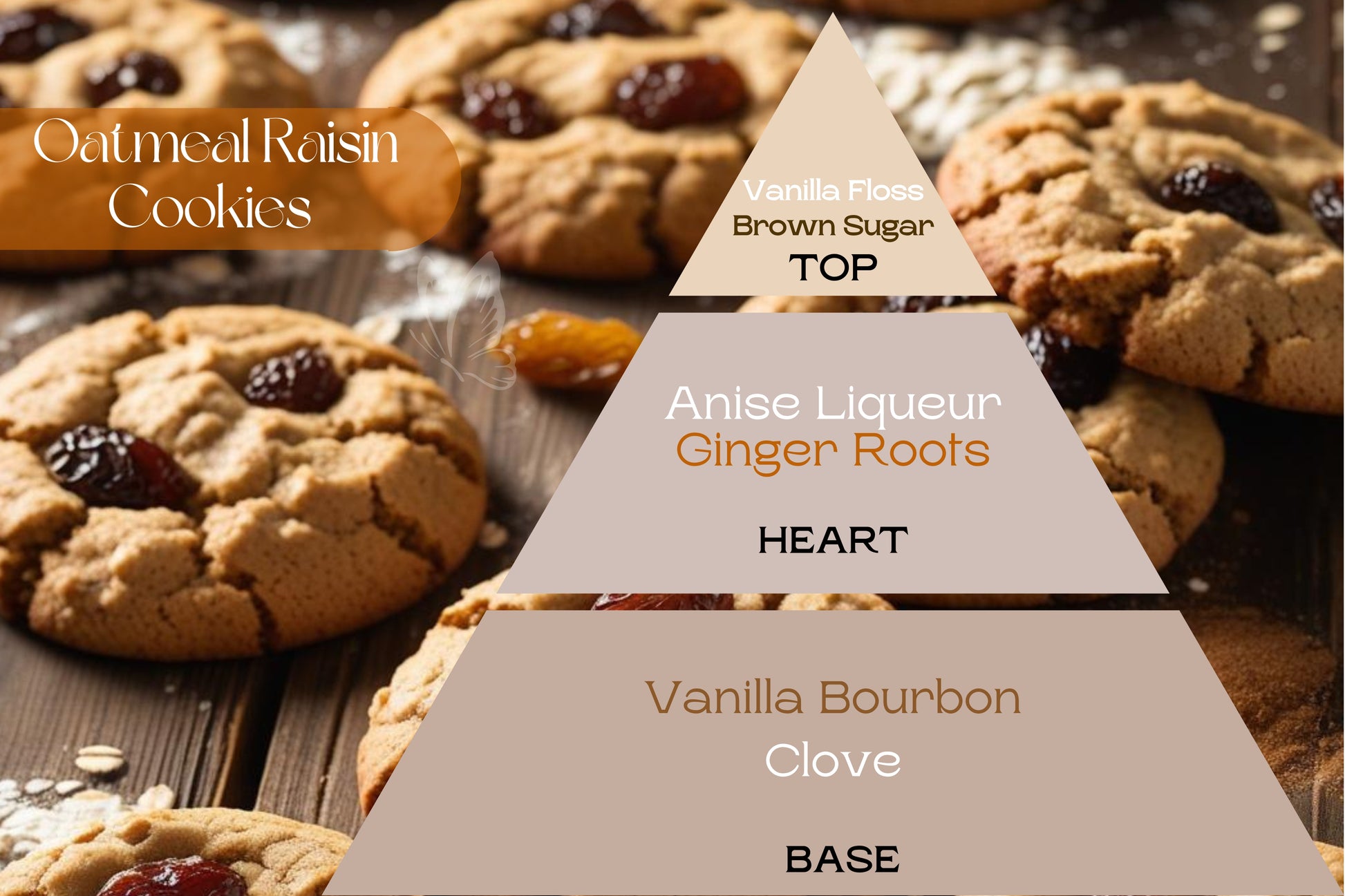 Fragancia única y deliciosa hará sentir como si estuvieras horneando galletas en casa. La masa de avena con pasas dulces, esta fragancia es exacta a un bocado de estas sabrosas galletas. Con notas de vainilla, licor de anís, pasas y azúcar moreno y un toque de clavo... Un cócktel perfecto para que tus creaciones huelan de maravilla. NO TE LA PUEDES PERDER!